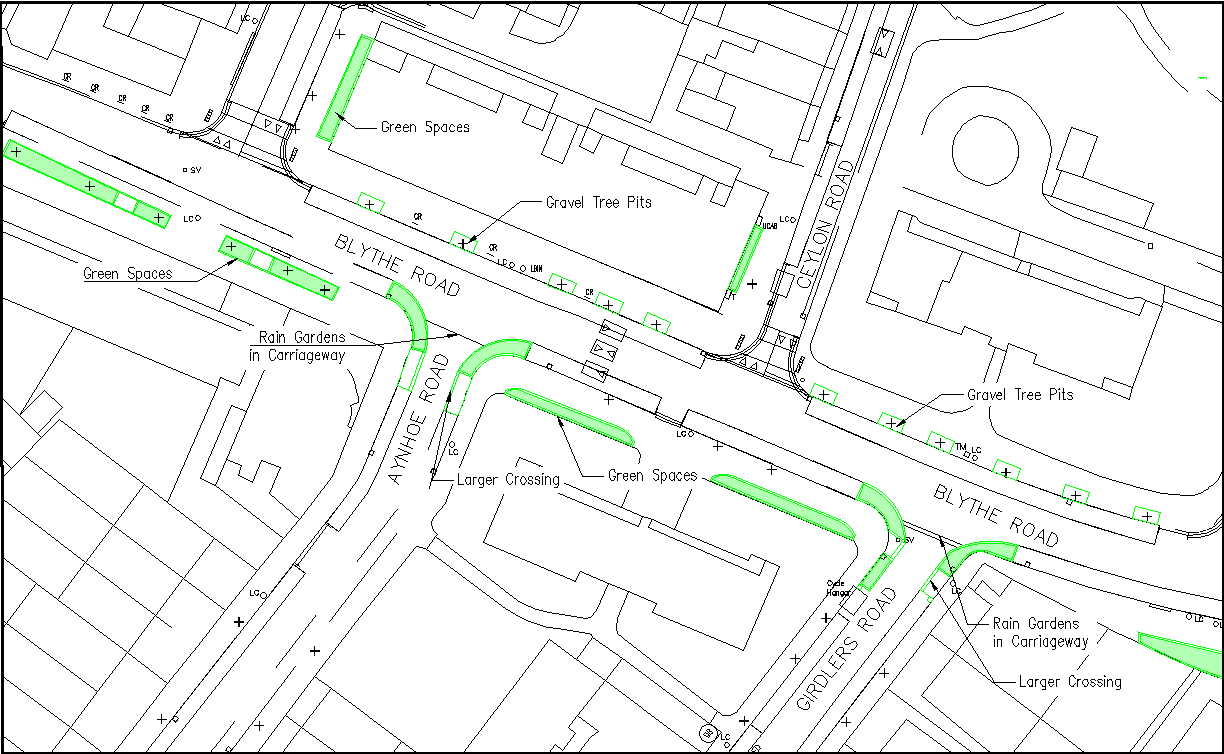 Raingardens with a larger crossing on the carriageway of Blythe Road, junctions with Aynhoe and Girdlers Road