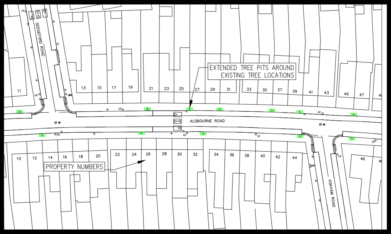 Plan view of proposal on Aldbourne Road with intended locationsTree pit planting and adoption